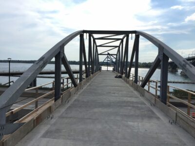 Cyclists and pedestrians traveling north along this piece of the Empire State Trail system will either chose to ascend the elevated approach to the overlook platform, a place to pause and take in the Buffalo River and surrounding area, or opt for the spur trail, to admire the cast piers of the elevated approach or cast a line at the water’s edge. From the overlook, patrons will pass over I-190 and CSX via a prefabricated steel truss bridge. This had to be erected under nighttime operations using a rolling I-190 closure. Passengers may admire the stainless steel artwork mounted on the bridge span day or night with lighting throughout this section of the trail. Both temporary and permanent retaining walls were used in this construction.